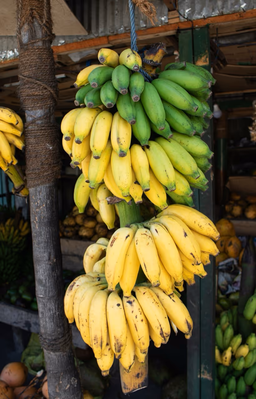 La banane se trouve toute l'année sur les étals grâce aux cultures tropicales. Les principales variétés sont la Cavendish (la plus courante, douce), la banane plantain (à cuire), la banane rouge (plus petite et sucrée), la banane rose. Choisissez-les selon votre usage : vertes pour une consommation ultérieure, jaunes pour une consommation immédiate, avec quelques taches brunes pour une banane très mûre et sucrée (parfaite en pâtisserie). Évitez les bananes grisâtres ou aux taches noires trop étendues, signes de sur-maturation.
